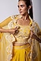 Featuring a yellow draped skirt in chinon taffeta base. It is paired with a silk taffeta blouse and an organza cape having cutwork embroidery. Accentuate with statement jewellery and heels for a complete look for haldi ceremony.