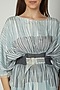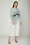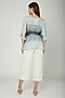 Featuring an aqua blue flared blouse in habutai silk base with stripes and attached belt. This contains only one piece.