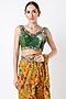 Featuring a mustard ruffled draped saree in georgette base with print. It is paired with a contrasting bottle green velvet blouse having zardosi hand embroidery and a belt. Accessorize it with dangler earrings and heels for a wedding or engagement ceremony.