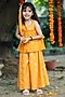 Featuring a yellow crop top for girls in chanderi base with frills. It is paired with flared palazzo pants having kantha, self motifs and zari boota detailing. Style it with sandals and a hair clip for a festive occasion, wedding or haldi ceremony.
