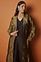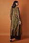 Featuring a metallic gold trench style jacket in crushed tissue base. It is paired with a black jumpsuit. Accentuate with statement earrings and heels for a complete look.