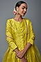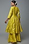 Featuring a lime yellow kali kurta in brocade base with motif. It is paired with matching palazzo pants and an organza dupatta.