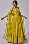 Featuring a lime yellow lehenga in chanderi silk base with bootas and zari border. It is paired with a matching strappy blouse and an organza striped dupatta.
