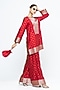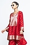 Featuring a red kurta in silk and satin base with woven floral brocade details on the neck and sleeves. It is paired with pants. Accentuate it with polki stud earrings, a potli bag and kolhapuri flats for festive occasion, cultural events or sangeet ceremony.