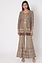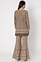 Featuring a brown lucknowi blouse in georgette, net and butter crepe base with embroidery. It is paired with matching sharara pants and short jacket having net frill detailing.