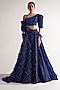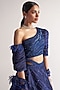 Featuring a midnight blue lehenga in net and assam silk base with sequins, swarovski and applique detailing. It is paired with a matching one shoulder blouse and a 3D butterfly dupatta. Perfect wear for a bridal look.