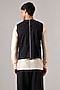 Featuring a black waistcoat-style bundi jacket in raw silk and cotton base with threadwork and hand embroidery. It is paired with a shirt and pants. Style it with mojaris for a festive occasion, cultural event, sangeet or engagement ceremony.
