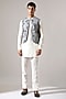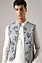 Featuring a grey bundi jacket in cotton base with single button closure and print. Style it with a kurta set and mojaris for a festive occasion, wedding, engagement or sangeet ceremony.