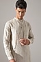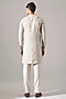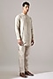 Featuring an ivory kurta in linen base with print, asymmetric panel and brass buttons. It is paired with pants. Style it with mojaris for a festive occasion, cultural event or wedding ceremony.