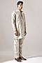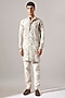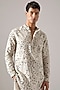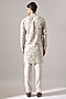Featuring an ivory kurta in linen base with diagonal pintuck detail and print. It is paired with trousers. Style it with mojaris for a festive occasion, cultural event, wedding or engagement ceremony.
