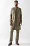 Featuring an olive kurta in linen base with pleated textured detail. It is paired with semi-elasticated waistband trousers having side pockets. Style it with mojaris and a watch for a festive occasion or wedding ceremony, exuding charm and elegance.