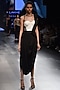 Featuring a black and white drape gown in crepe lycra and scuba georgette base with PVC embroidery and ruffle detailing on one side.