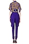 This set features a midnight blue high waisted cowl breeches pants in stretchable satin base with zipper closure on the side. It is paired with matching midnight blue halter neck bustier and organza front open bell sleeves jacket with gold zardozi and pearl work scalloped embroidery on the front and back.