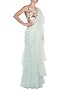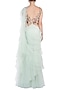 Featuring a pista green ruffled gown saree in silk base with cut pipes, beads and thread embroidery.