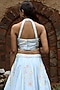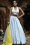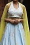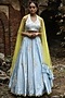 Featuring a powder blue lehenga in georgette base with embroidery and organza border. It is paired with a matching halter neck embroidered blouse and a contrasting yellow net dupatta.