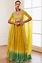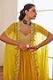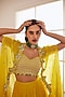 Featuring a yellow and blue ombre gathered lehenga in upada silk and georgette base. It is paired with a matching yellow strapped choli and an organza cape.
