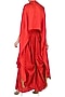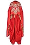 Featuring a red high low cape in raw silk base with hand embroidery and gold tassel detailing along the hem. It is paired with a matching dhoti.