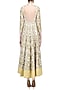 Featuring a white floor length anarkali in blended cotton silk embroidered with gold zari jaal all over and round key hole back. It comes along with a beige net dupatta with gold lace and tassel hanging.
