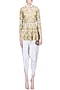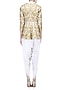 This set features a white peplum short kurta in blended cotton silk with golden zari work all over. It is paired with a white dhoti pants in satin.