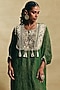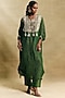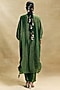 Featuring a green long kaftan in crush tissue base with hand embroidery. It is paired with crepe tissue straight pants. Accentuate it with statement polki jewellery, soft waves or a sleek bun, and embellished heels for a stunning festive or mehendi look.
