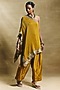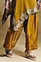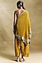 Featuring a mustard one-shoulder top in crush tissue base with hand embroidery. It is paired with crepe tissue farshi salwar pants. Accentuate it with statement polki jewellery, soft waves or a sleek bun, and embellished heels for a stunning festive or haldi look.