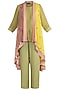 Featuring an olive green short kurta in linen georgette base. It is paired with matching straight pants and waterfall jacket in chanderi base.