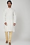 Featuring a beige sherwani in raw silk base with zardosi embroidery. It is paired with a matching kurta and churidar pants.