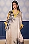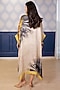 Featuring a beige asymmetric dress in satin base with print, bead embellishment and thread work. Accentuate it with statement earrings, heels and a clutch for an evening look.