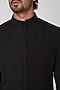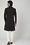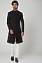 Featuring a black sherwani in terry wool fabric. It is paired with contrasting white pants.