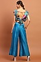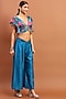 Featuring a blue frilled top in satin base with print. It is paired with matching box pleated pants.