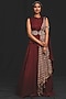 Featuring a deep maroon front-open peplum top in cotton silk base with an attached drape having embroidery, floral, and moroccan print. It is paired with a matching skirt and a belt