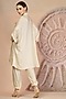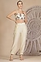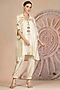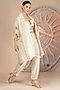 Featuring an ivory jacket in muslin silk base with beadwork and patchwork detailing. It is paired with a bustier and pants. Accentuate it with statement earrings and heels for a festive look.