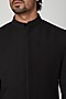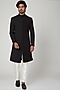 Featuring a black sherwani in terry wool fabric. It is paired with contrasting white pants.