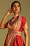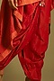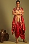 Featuring a light peach top in handloom tussar silk base with thread and zardosi embroidery including floral print. It is paired with contrasting cherry red pleated pants, a staple cape and a belt having leather straps and a metal buckle.