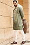 Featuring a pastel pista open jacket in silk base with embroidery. It is paired with a matching kurta and off white box pants.