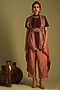 Featuring an old mauve top for girls in handloom tussar silk base with thread and zardosi embroidery including floral print. It is paired with contrasting salmon pink pleated pants, a staple cape and a belt having leather straps and a metal buckle.