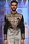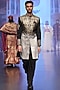 Featuring a black and gold indo western in velvet and brocade base with print and zari work. It is paired with matching pants.