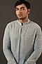 Featuring a duck egg blue front-open lucknowi kurta in georgette base. It is paired with contrasting off-white box pants.