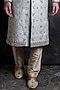 Featuring a powder blue sherwani in raw silk base with embellishments. It is paired with kurta, pants, a stole, a safa, a mala and pair of juttis. Perfect attire for your weddings, sangeet or engagement ceremony, exuding traditional charm and elegance.