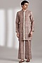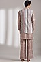 Featuring an ivory indowestern jacket in handloom silk base with print. It is paired with a contrasting pale pink printed kurta and pants.