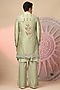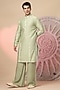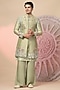 Featuring a light green jacket in chanderi silk base with embroidery. It is paired with a kurta and pants. Perfect wear for any wedding, sangeet or pre-wedding ceremony.