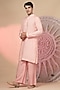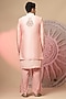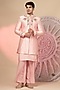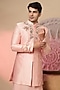 Featuring a light pink jacket in chanderi silk base with embroidery. It is paired with a kurta and pants. Perfect wear for any wedding, sangeet or pre-wedding ceremony.
