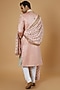Featuring a powder pink sherwani in silk base with zardosi embroidery. It is paired with a matching kurta, an off-white box pants, a dual-tone stole and a mala.