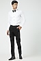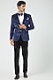 Featuring a royal blue tuxedo in velvet base. It is paired with a matching bow, a white shirt, and black pants.