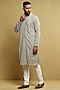 Featuring a sage green kurta in georgette base. It is paired with pyjama pants. This attire would be an excellent fit for any festive occasion or sangeet ceremony.