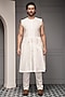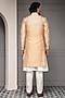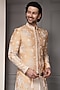 Featuring a soft peach sherwani in silk blend base with thread embroidery. It is paired with a kurta and cotton silk trousers. Style it with mojaris for a wedding, sangeet or engagement ceremony.