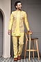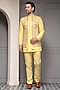 Featuring a sunshine yellow bandhgala in silk blend jacquard fabric base with embroidery. It is paired with a suiting fabric kurta and trousers. Style it with shoes for a reception, wedding, haldi, sangeet or engagement ceremony.
