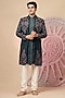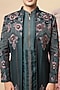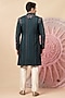 Featuring a teal sherwani in handloom base with embroidery. It is paired with a kurta, printed shawl and ivory pants. Style it up with mojaris for a wedding, sangeet or engagement ceremony.