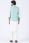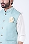 Featuring a duck egg blue bundi jacket in silk base. It is paired with a contrasting white kurta and pants.