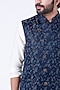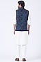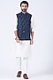 Featuring a navy blue bundi jacket in silk base. It is paired with a contrasting white kurta and pants.